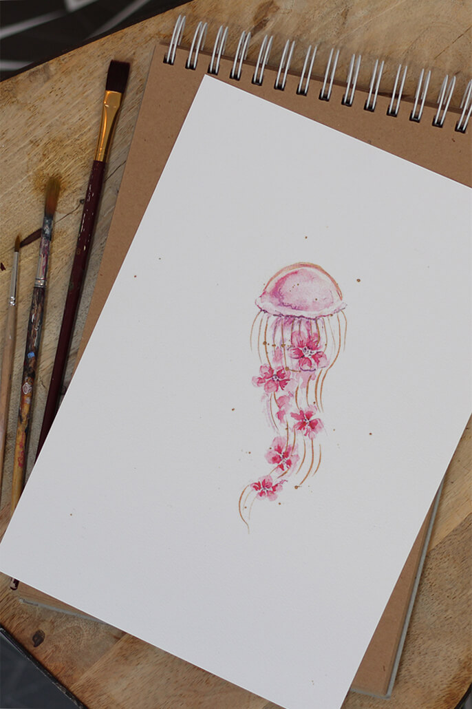 A4-print van een roze kwal met bloemen en goudkleurige detailsA4-print van een roze kwal met bloemen en goudkleurige details