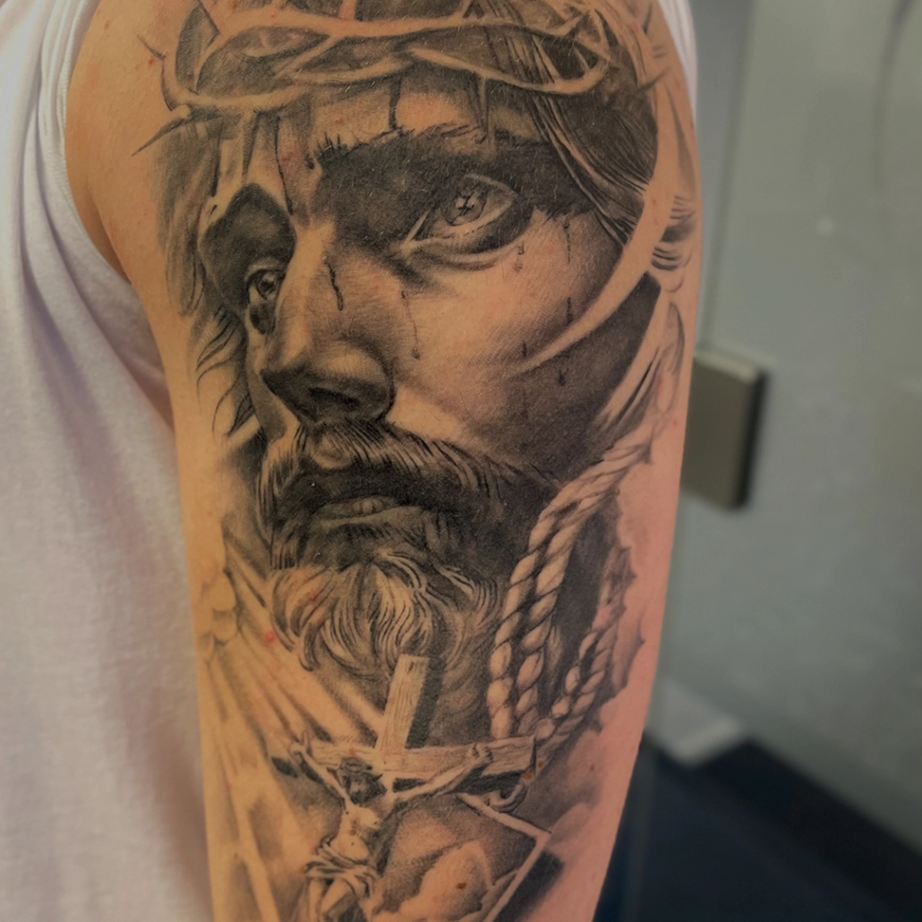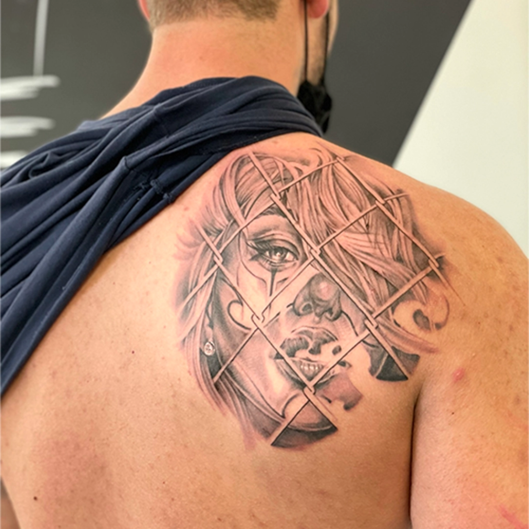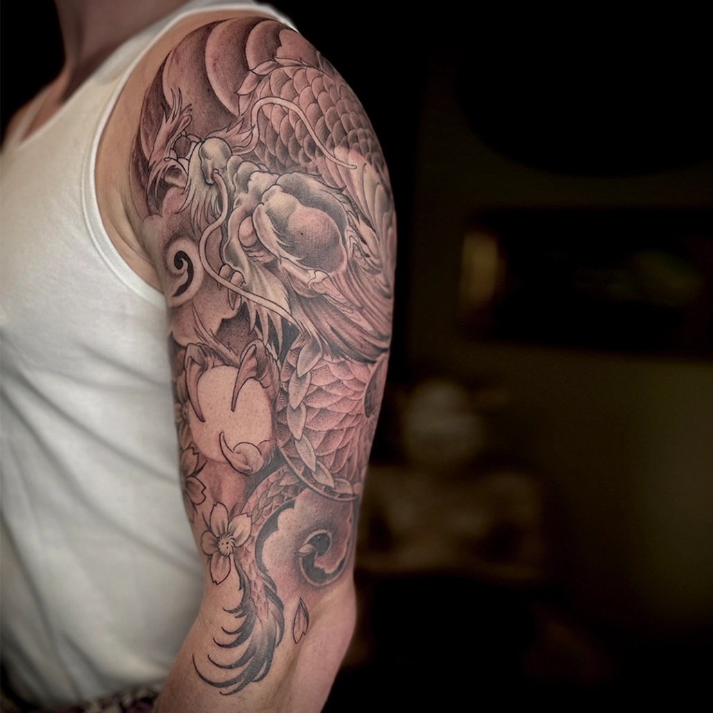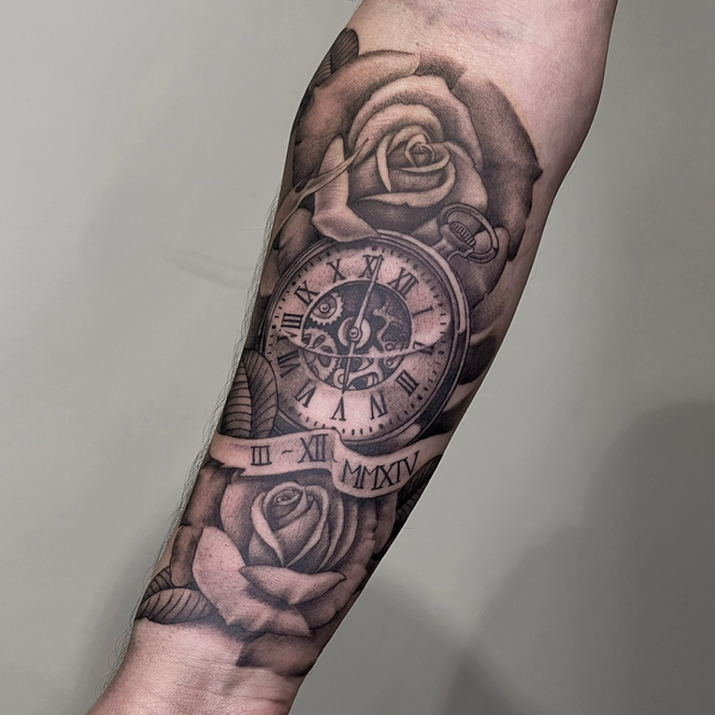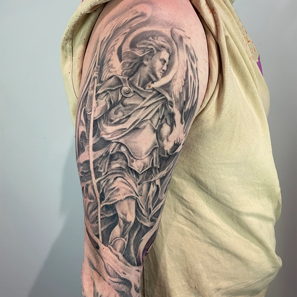 Ik wil je graag aan Jeroen voorstellen! Zijn stijl? Kneitervette lettering, krachtige thrash tattoos en ontwerpen die altijd in balans zijn, gemaakt voor jouw lichaam. Hij haalt zijn inspiratie uit de Japanse, Italiaanse en Nederlandse oude meesters uit de schilderkunst. Dat zie je terug in zijn werk: helder, gelaagd, technisch sterk – met respect voor traditie én voor de huid.