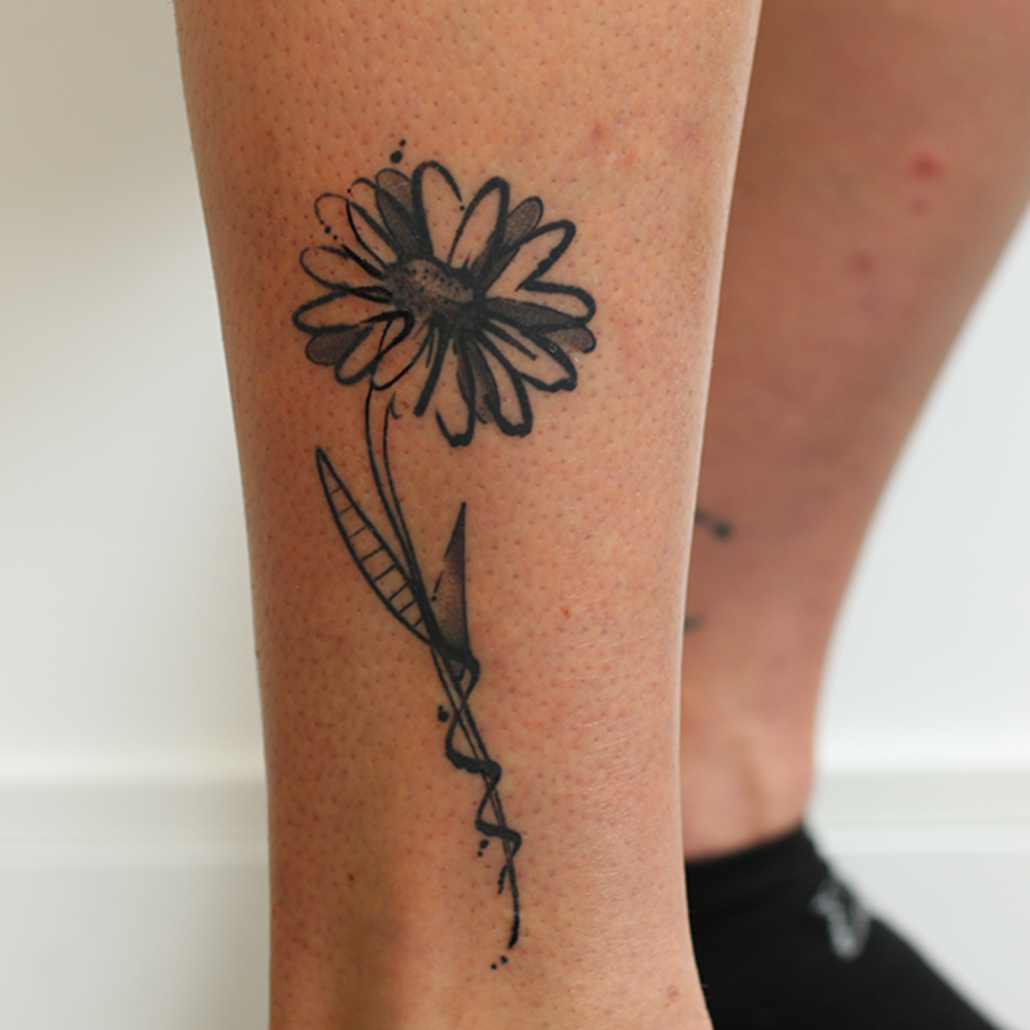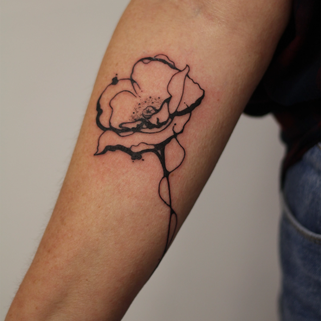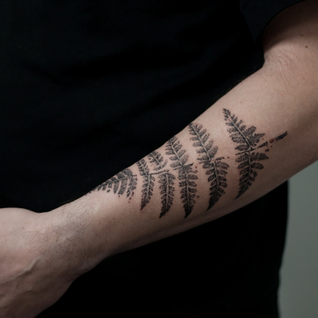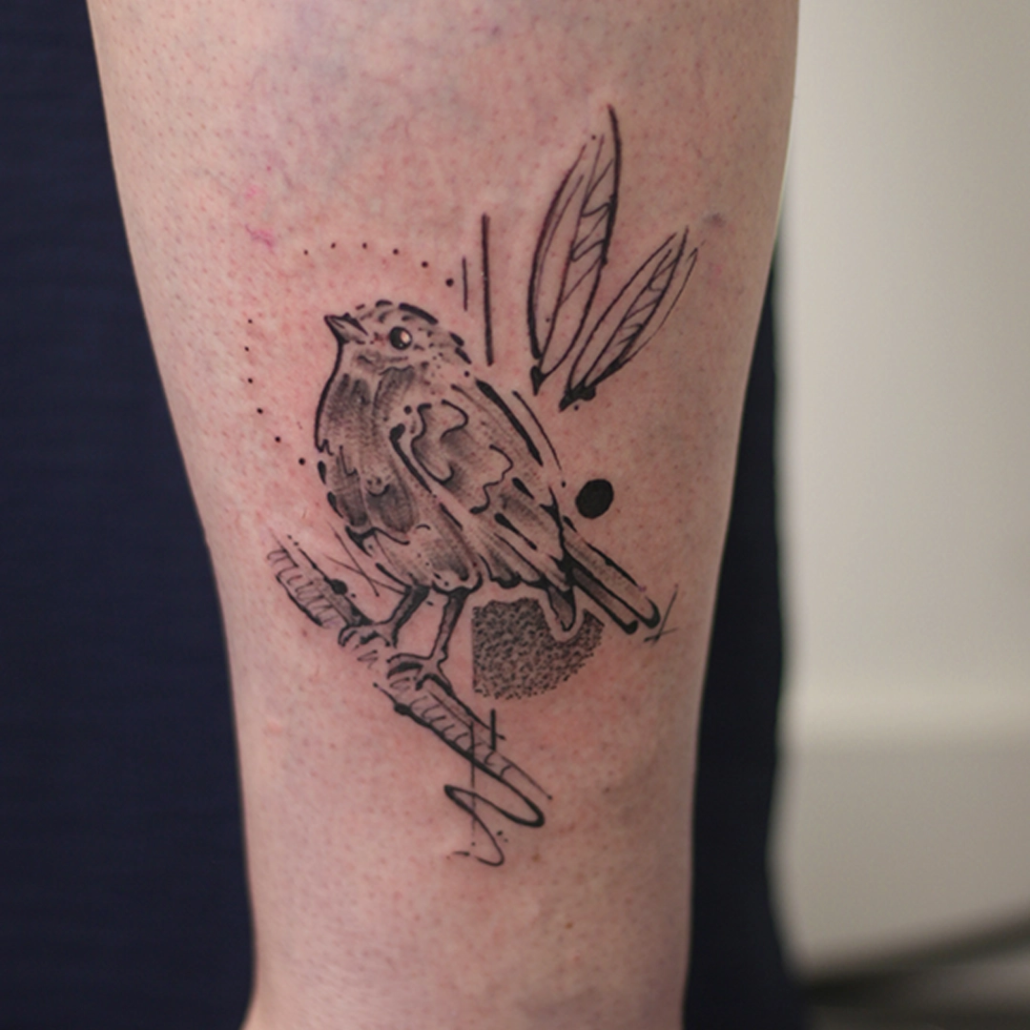 Mijn werk is vaak een combinatie van technieken en onderwerpen: botanisch met abstracte vormen, geometrische ontwerpen met een kleurelement of dotwork met witruimte. Anderen typeren mijn werk als iets dat altijd een grafisch element heeft en de grens van contrasteren oprekt. Favoriete en terugkerende thema’s zijn dieren, planten, natuur en spiritualiteit. Ik vind het belangrijk dat een werk ‘dynamisch’ is: dat de betekenis ervan op meerdere manieren te interpreteren is en in de loop der tijd meegroeit met de drager. Om deze reden werk het liefst analoog aan handgemaakte ontwerpen, zoals met grafiet, Oost-Indische inkt of lino stempels. De willekeur, structuren en organische vormen van deze technieken: deze kun je zelf niet bedenken en laten zich op unieke wijze verlaten naar een tattoo.