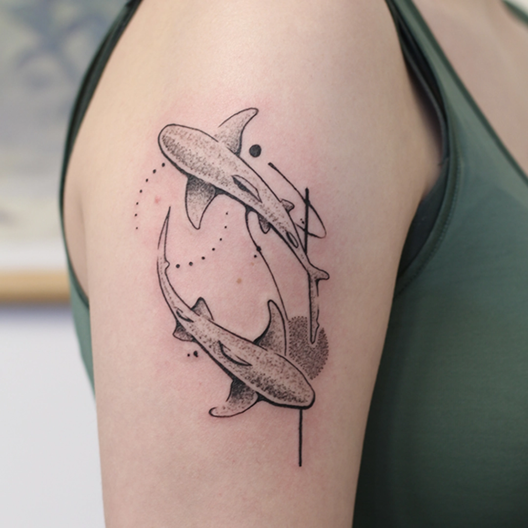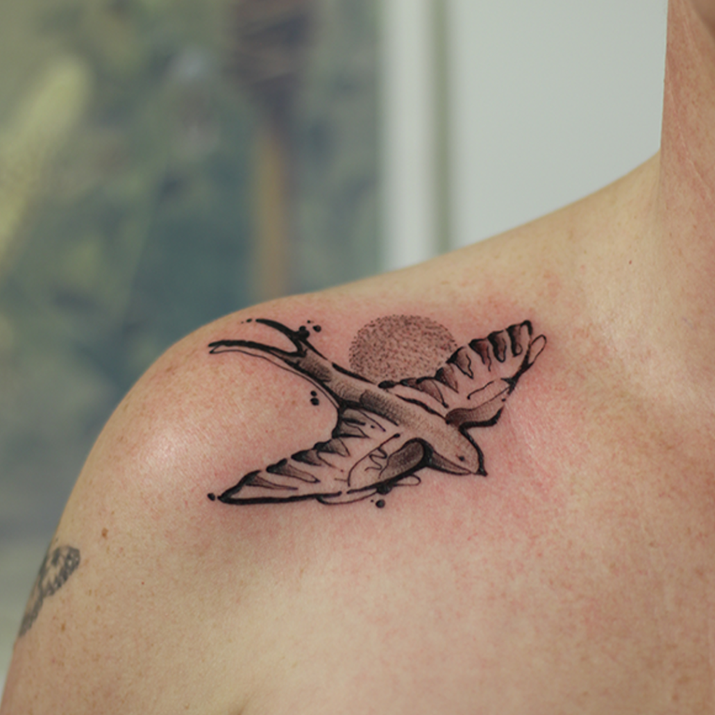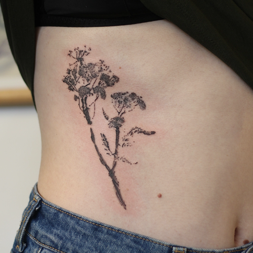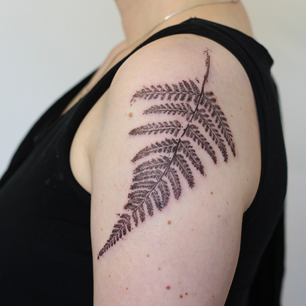 Mijn werk is vaak een combinatie van technieken en onderwerpen: botanisch met abstracte vormen, geometrische ontwerpen met een kleurelement of dotwork met witruimte. Anderen typeren mijn werk als iets dat altijd een grafisch element heeft en de grens van contrasteren oprekt. Favoriete en terugkerende thema’s zijn dieren, planten, natuur en spiritualiteit. Ik vind het belangrijk dat een werk ‘dynamisch’ is: dat de betekenis ervan op meerdere manieren te interpreteren is en in de loop der tijd meegroeit met de drager. Om deze reden werk het liefst analoog aan handgemaakte ontwerpen, zoals met grafiet, Oost-Indische inkt of lino stempels. De willekeur, structuren en organische vormen van deze technieken: deze kun je zelf niet bedenken en laten zich op unieke wijze verlaten naar een tattoo.