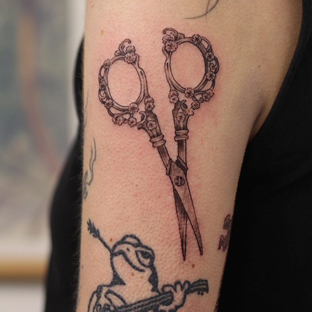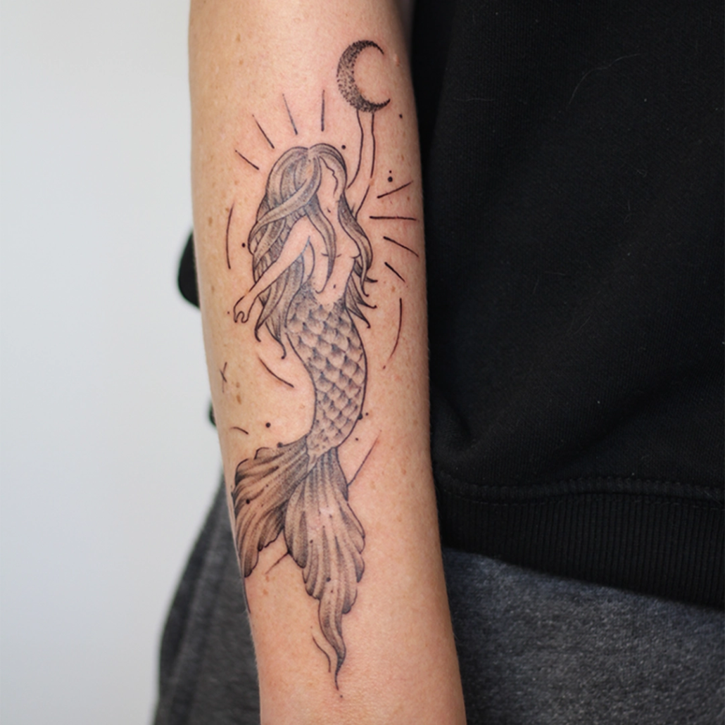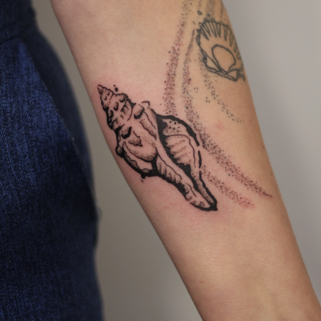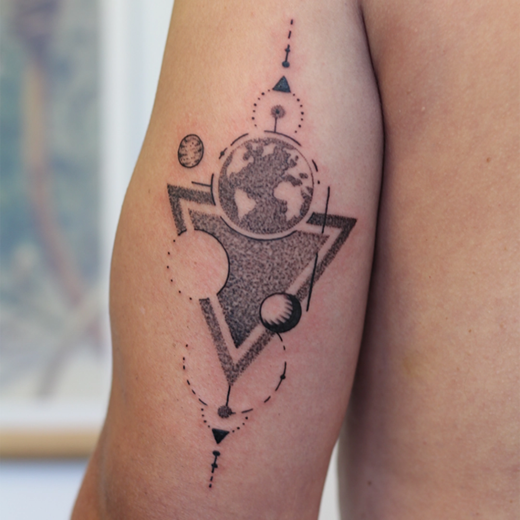 Mijn werk is vaak een combinatie van technieken en onderwerpen: botanisch met abstracte vormen, geometrische ontwerpen met een kleurelement of dotwork met witruimte. Anderen typeren mijn werk als iets dat altijd een grafisch element heeft en de grens van contrasteren oprekt. Favoriete en terugkerende thema’s zijn dieren, planten, natuur en spiritualiteit. Ik vind het belangrijk dat een werk ‘dynamisch’ is: dat de betekenis ervan op meerdere manieren te interpreteren is en in de loop der tijd meegroeit met de drager. Om deze reden werk het liefst analoog aan handgemaakte ontwerpen, zoals met grafiet, Oost-Indische inkt of lino stempels. De willekeur, structuren en organische vormen van deze technieken: deze kun je zelf niet bedenken en laten zich op unieke wijze verlaten naar een tattoo.